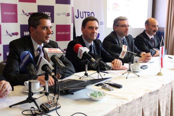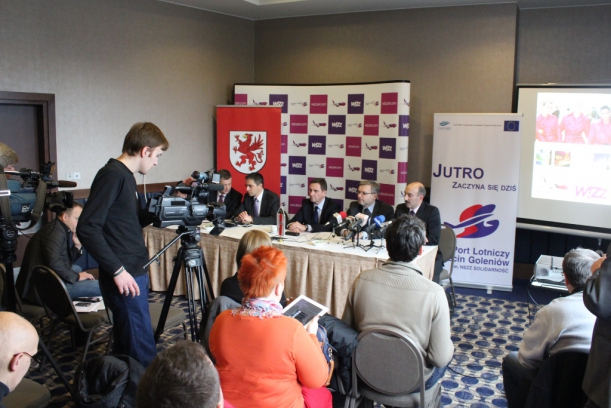 W sali Reymont szczecińskiego hotelu Radisson Blu z dziennikarzami spotkali się wicemarszałek województwa zachodniopomorskiego Andrzej Jakubowski, dyrektor handlowy Wizz Air György Abrán, zastępca prezydenta Szczecina Dariusz Wąs oraz Maciej Dziadosz, prezes PL Szczecin-Goleniów.
