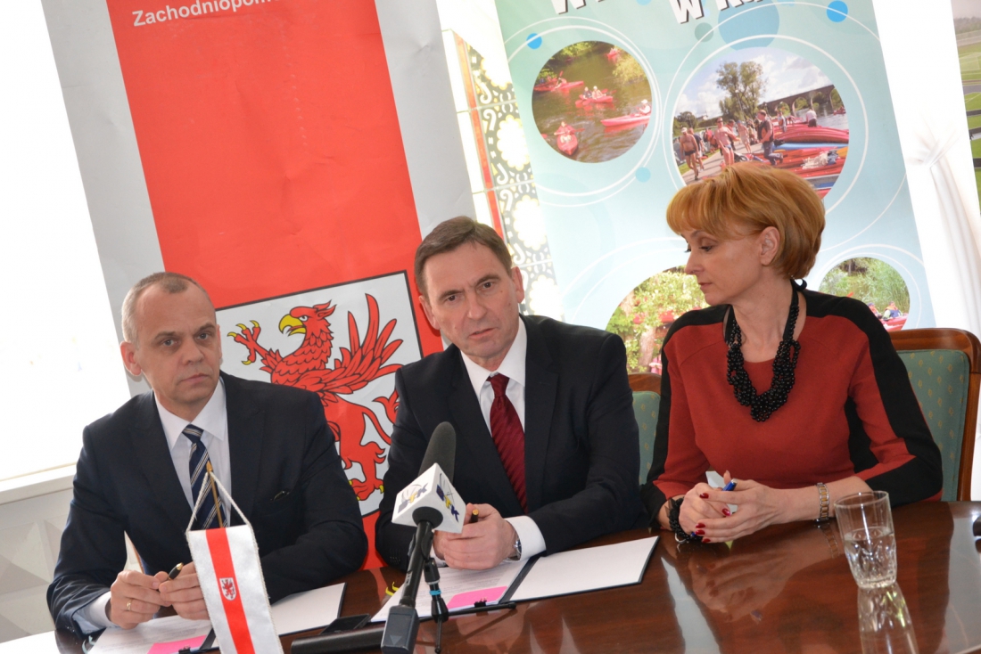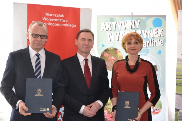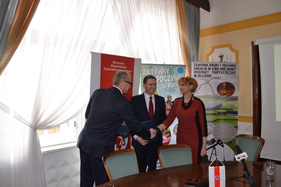 Marszałkowie Andrzej Jakubowski i Anna Mieczkowska odwiedzili dzisiaj Urząd Miejski w Karlinie, gdzie złożyli swoje podpisy pod umową o dofinansowanie projektu „Wspólna rewitalizacja infrastruktury zabytkowej w centrach miast Karlino – Wolgast – zagospodarowanie terenu przy ul. Konopnickiej”.