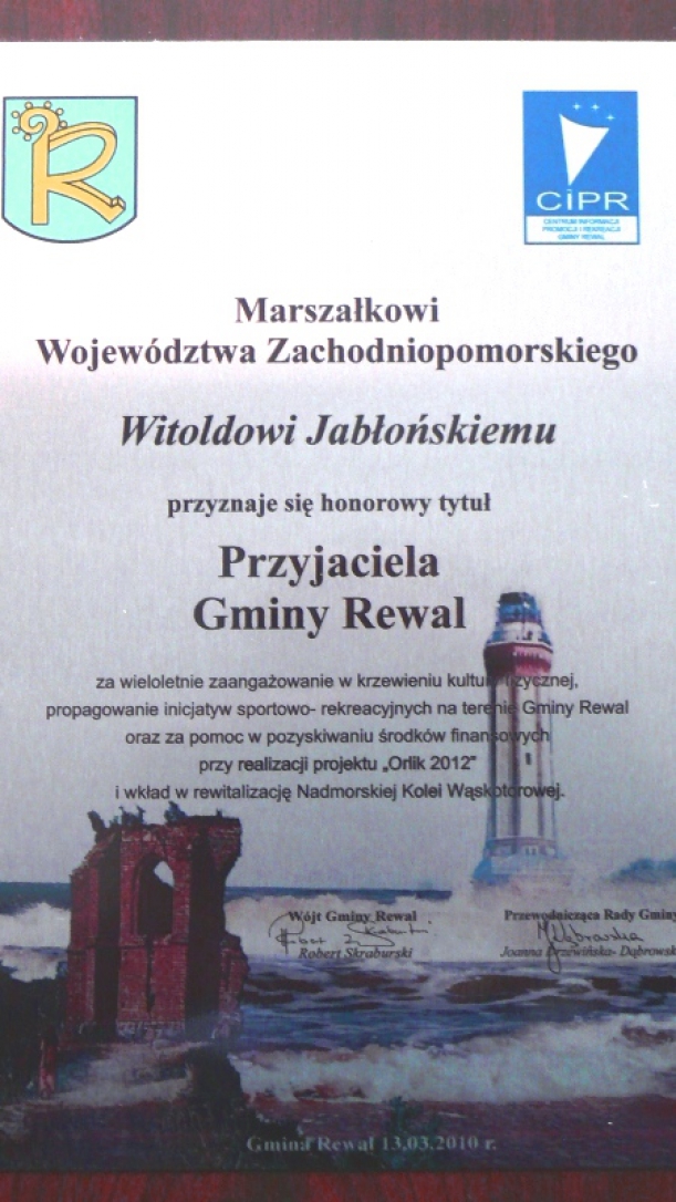 Zaszczytny tytuł Przyjaciela Gminy Rewal otrzymał wicemarszałek Witold Jabłoński. Honorowe wyróżnienie zostało przyznane podczas VII Gali Turystyki w Niechorzu, która odbyła się 13 marca 2010 r.