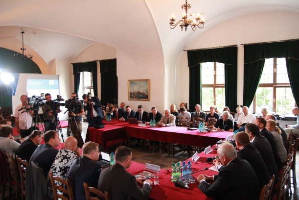Marszałek Olgierd Geblewicz otwierając spotkanie rozpoczął od podziękowań, które adresował do wszystkich uczestników działań na rzecz poszerzenia granic SSE. – To była gra zespołowa - akcentował. Jego zdaniem, zachodniopomorski potencjał wiele zyska po tej decyzji rządu. – Obecnie mamy już 836 ha specjalnych stref ekonomicznych do dyspozycji inwestorów – mówił marszałek – na prawie 400 ha toczy się już produkcja pełna parą. Następnie marszałek nawiązał do planowanych inwestycji KSO i Teleyardu. Deklarował daleko idącą pomoc przy realizacji projektów, czego dowodem było symboliczne przekazanie w ręce dyrektora Piotra Sussa Uchwały Zarządu Województwa o przyznaniu dofinansowania na budowę przeprawy mostowo-drogowej na wyspę Gryfia.