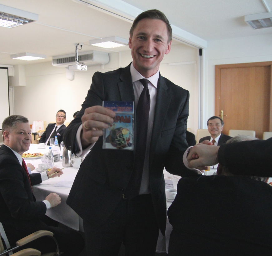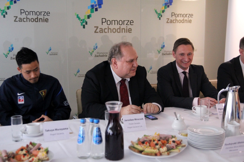 Przy stole konferencyjnym Urzędu Marszałkowskiego zasiedli także: przedstawiciele firmy MITSUI - Toshiyuki Shimoda, dyrektor Biura Mitsui w Warszawie, Kensuke Kubota, dyrektor działu, Mitsui Europe, Londyn, Shin Yasuda, wydawca japońskich komiksów, właściciel sieci Takumi Sushi Box, Takenori Tadokoro, dyrektor Yamaha Music, odział w Polsce, Makoto Kuriya, pianista jazzowy z Tokio, oraz piłkarze Pogoni - Takafumi Akahoshi i Takuya Murayama.