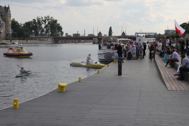 Aleksander Doba dobił do nadodrzańskiego nabrzeża w asyście kajakarzy z eskorty honorowej. Ten szczególny moment podkreślił muzyczny tusz Orkiestry Wojskowej VIII Flotylli Obrony Wybrzeża ze Świnoujścia.
