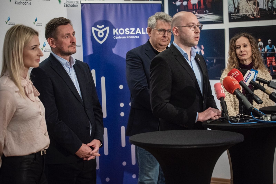 W konferencji prasowej wzięli udział: Wicemarszałek Województwa Zachodniopomorskiego Jakub Kowalik, Radne Województwa Małgorzata Hołub-Kowalik i Karolina Siwek, Prezydent Koszalina Tomasz Sobieraj oraz Dyrektor Bałtyckiego Teatru Dramatycznego Andrzej Mielcarek.