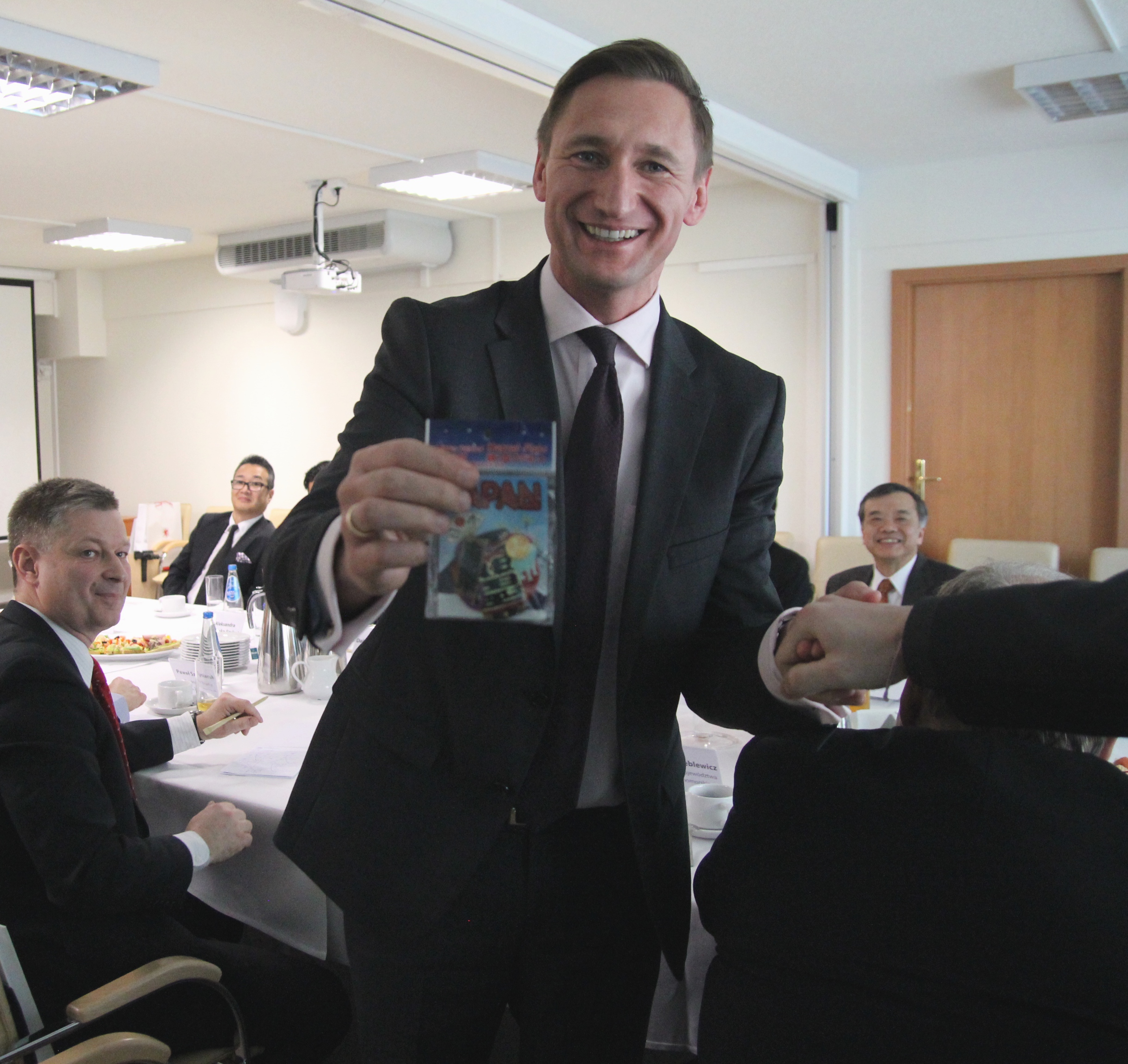 Przy stole konferencyjnym Urzędu Marszałkowskiego zasiedli także: przedstawiciele firmy MITSUI - Toshiyuki Shimoda, dyrektor Biura Mitsui w Warszawie, Kensuke Kubota, dyrektor działu, Mitsui Europe, Londyn, Shin Yasuda, wydawca japońskich komiksów, właściciel sieci Takumi Sushi Box, Takenori Tadokoro, dyrektor Yamaha Music, odział w Polsce, Makoto Kuriya, pianista jazzowy z Tokio, oraz piłkarze Pogoni - Takafumi Akahoshi i Takuya Murayama.