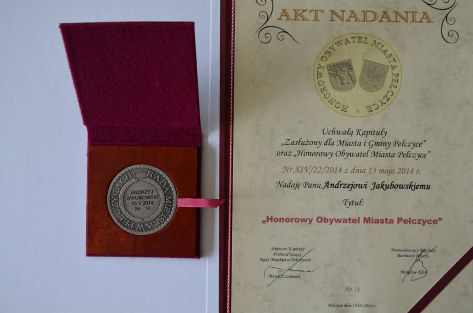 Wyróżnienie wręczone zostało zgodnie decyzją kapituły. - Uchwałą kapituły „Zasłużony dla Miasta i Gminy Pełczyce” oraz „Honorowy Obywatel Miasta Pełczyce” Nr XIV/22/2014 z dnia 15 maja 2014 roku nadaję Panu Andrzejowi Jakubowskiemu tytuł „Honorowego Obywatela Miasta Pełczyce” - odczytali treść aktu nadania burmistrz Pełczyc Mirosław Kluk oraz sekretarz kapituły i przewodniczący Rady Miejskiej Marek Szczepanik.