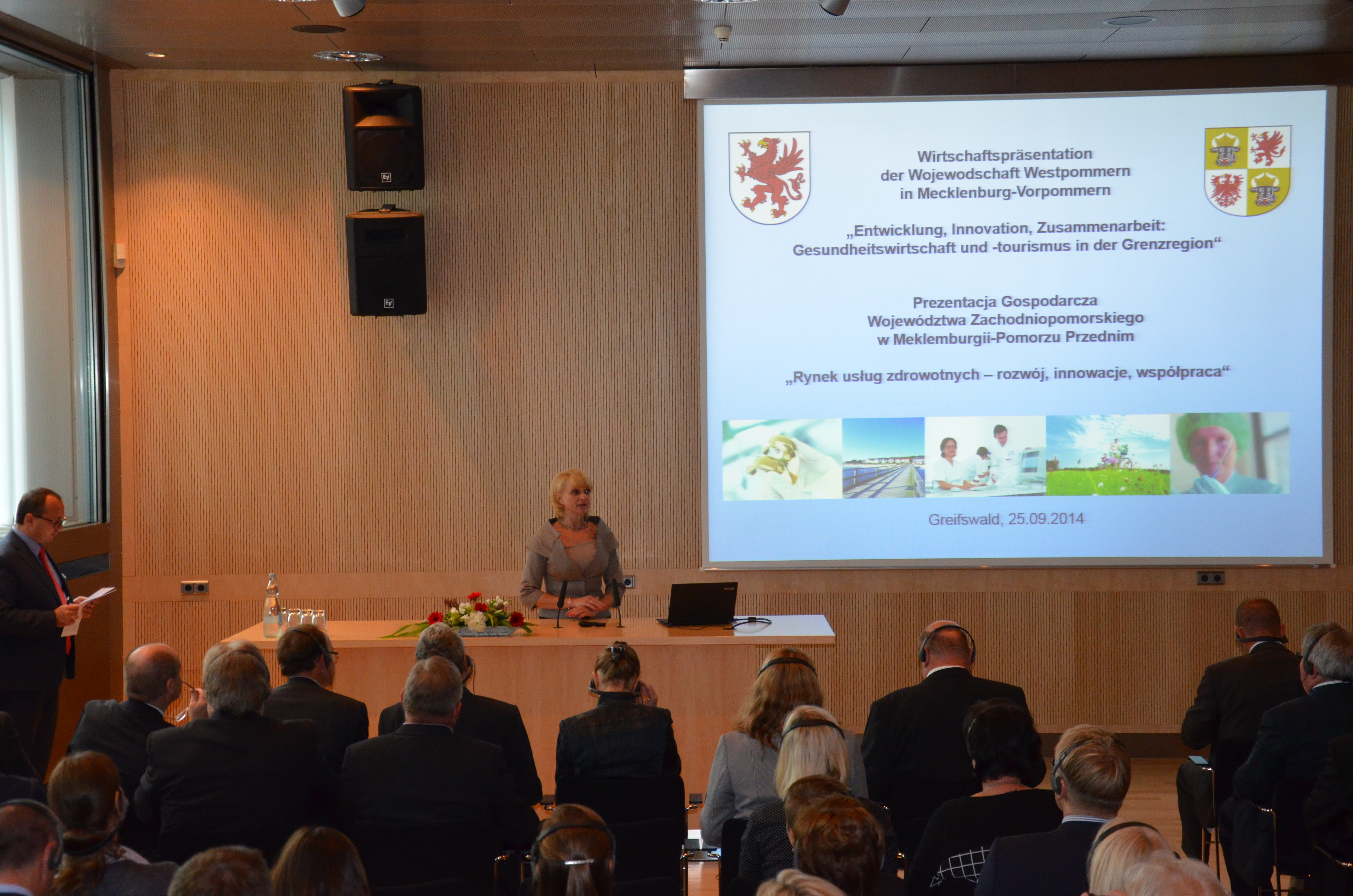 Przybyłych na to spotkanie gości przywitał także ze strony gospodarzy Harry Glawe, Minister Gospodarki, Budownictwa i Turystyki Meklemburgii-Pomorza Przedniego. Zwrócił on uwagę na to, że wzajemne naprzemienne prezentacje gospodarcze obu regionów stały się dobrą tradycją, a wybór tematyki trafny zwłaszcza w obliczu problemów demograficznych oraz możliwego przedłużenia także w Niemczech wieku emerytalnego do 67 roku życia. Dodał, że Meklemburgia-Pomorze Przednie przygotowała już swój masterplan w zakresie ochrony zdrowia, ale potrzebuje jeszcze interesujących pomysłów i inicjatyw, aby ten plan wypełnić. Następnie Anna Mieczkowska wygłosiła wykład pt. „Organizacja systemu ochrony zdrowia w Polsce i w Województwie Zachodniopomorskim w kontekście sektora publicznego i prywatnego.” Ze strony niemieckiej referat główny pt. „Aktualne kierunki rozwoju współpracy transgranicznej na rynku usług zdrowotnych” wygłosił prof. dr med. Marek Zygmunt z Kuratorium Gospodarki Zdrowotnej Meklemburgii-Pomorza Przedniego. Po części plenarnej odbyły się dwa równoległe warsztaty. Pierwszy został poświęcony branży medycznej i kierunkom jej rozwoju, natomiast drugi turystyce zdrowotnej. Pod hasłem „Podróże zdrowia” zaprezentowały się m.in. zachodniopomorskie uzdrowiska z Kołobrzegu i Świnoujścia.