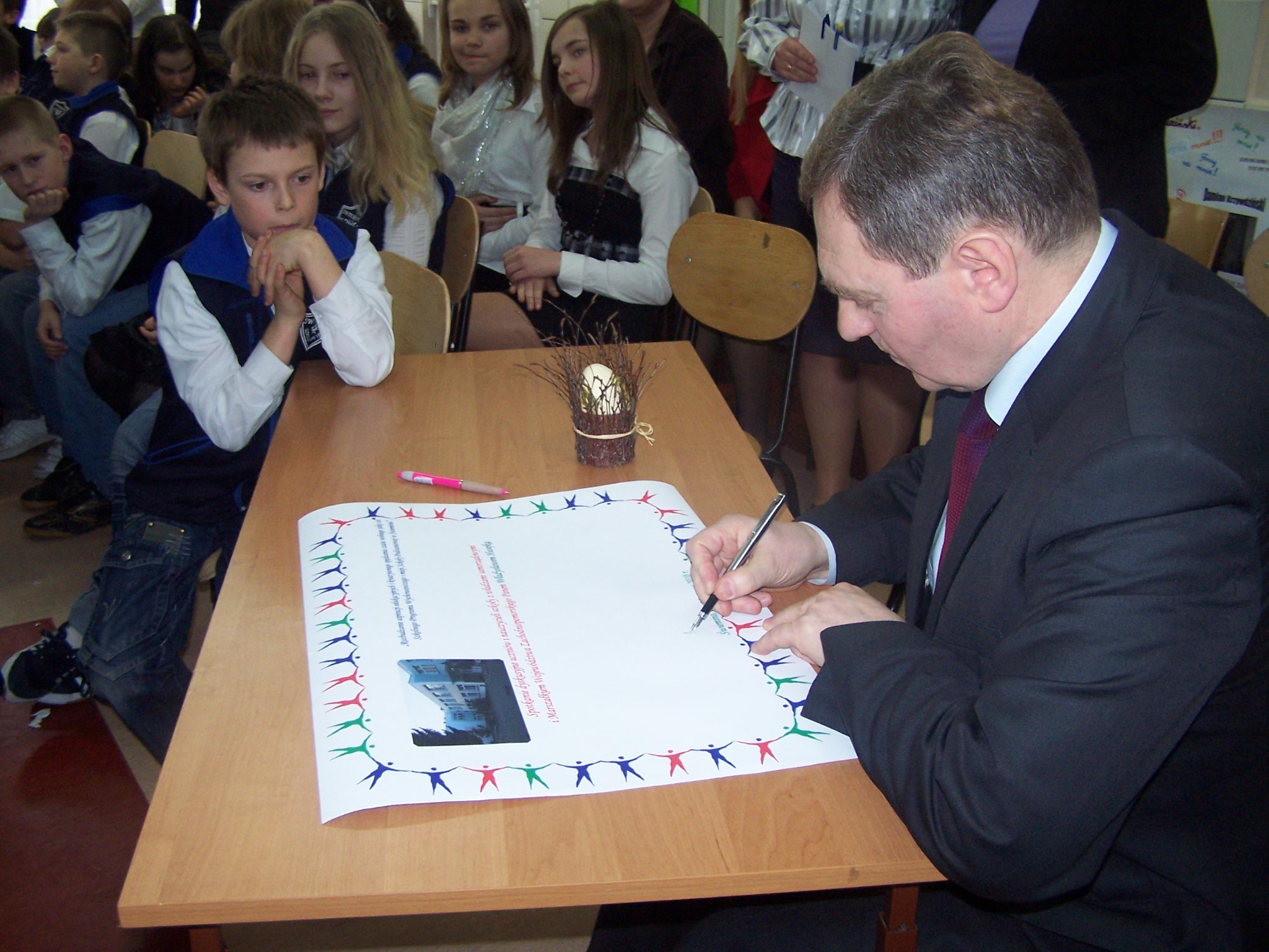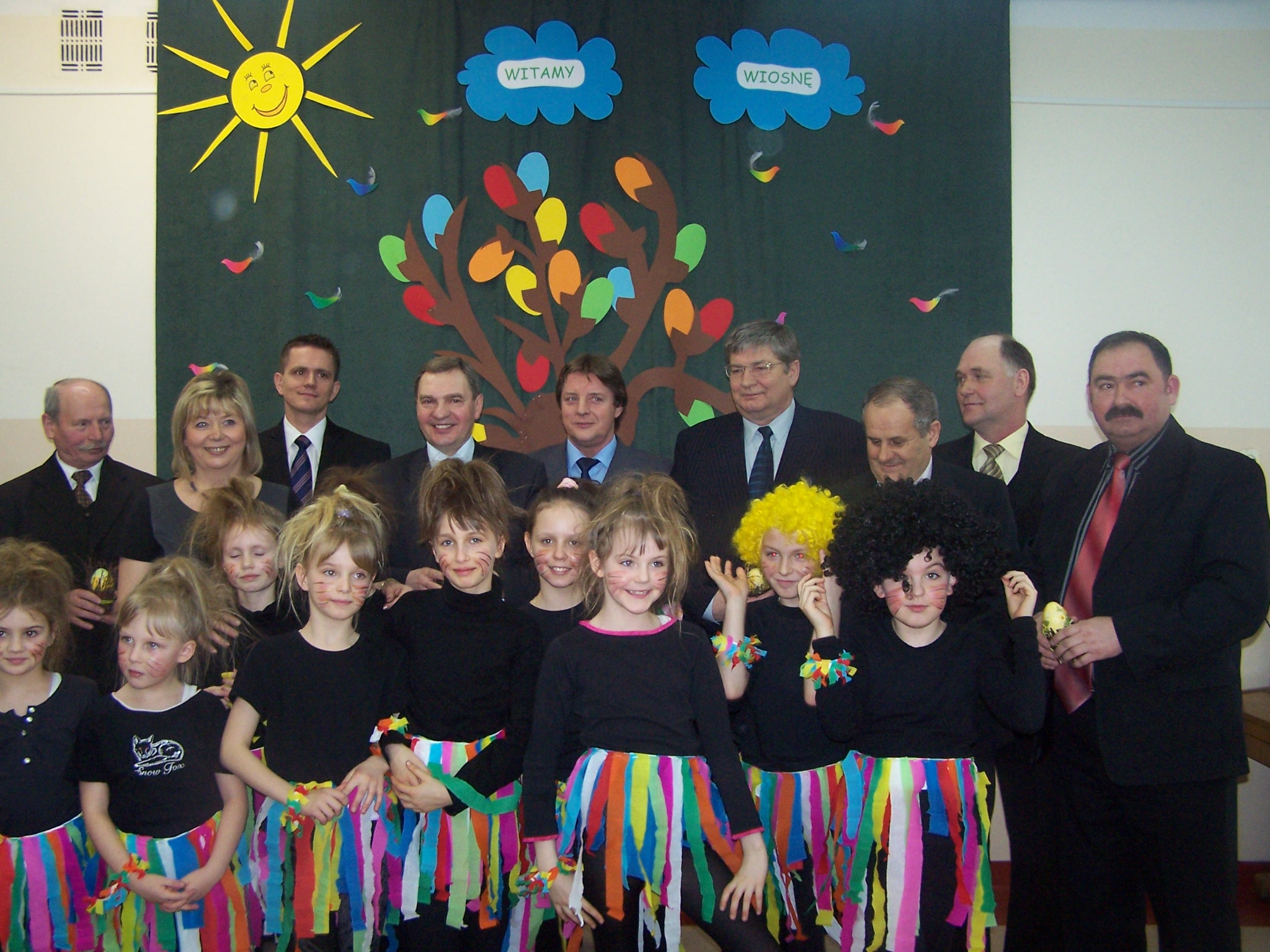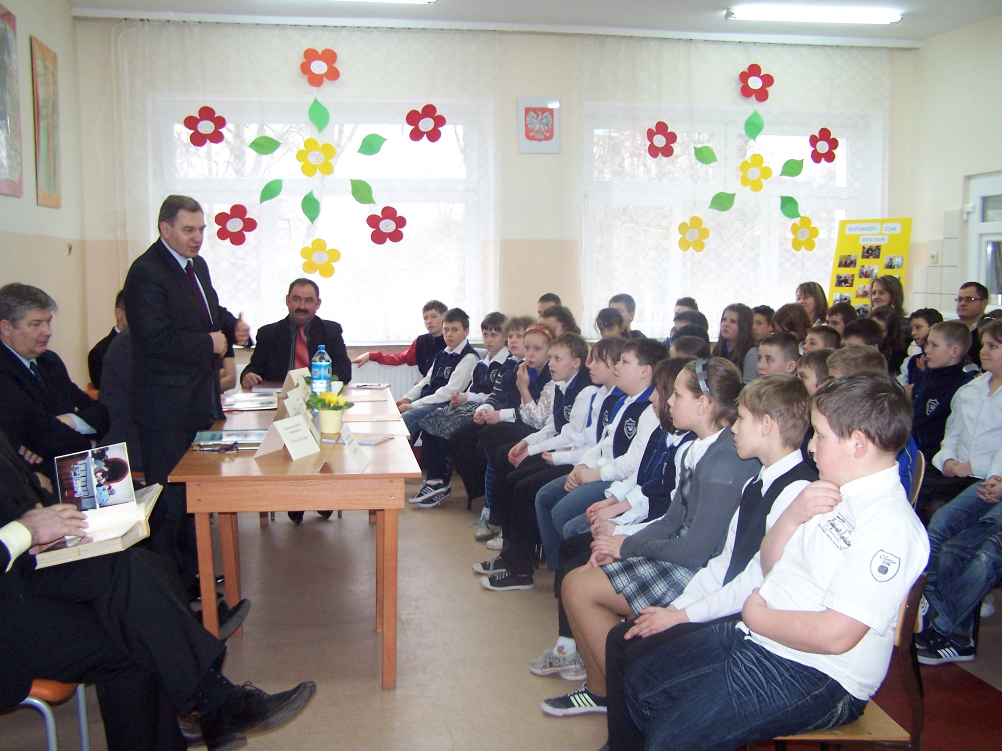Goście obejrzeli przedstawienie „Powitanie wiosny” w wykonaniu najmłodszych uczniów i dzieci z oddziału przedszkolnego. Na zakończenie Władysław Husejko przekazał na rzecz szkolnej biblioteki podarunki, które idealnie wpisały się w atmosferę spotkania: słowniki ortograficzne i języka angielskiego.