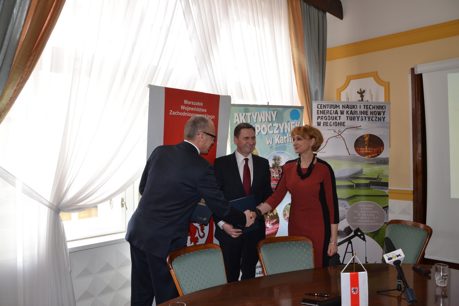Marszałkowie Andrzej Jakubowski i Anna Mieczkowska odwiedzili dzisiaj Urząd Miejski w Karlinie, gdzie złożyli swoje podpisy pod umową o dofinansowanie projektu „Wspólna rewitalizacja infrastruktury zabytkowej w centrach miast Karlino – Wolgast – zagospodarowanie terenu przy ul. Konopnickiej”.