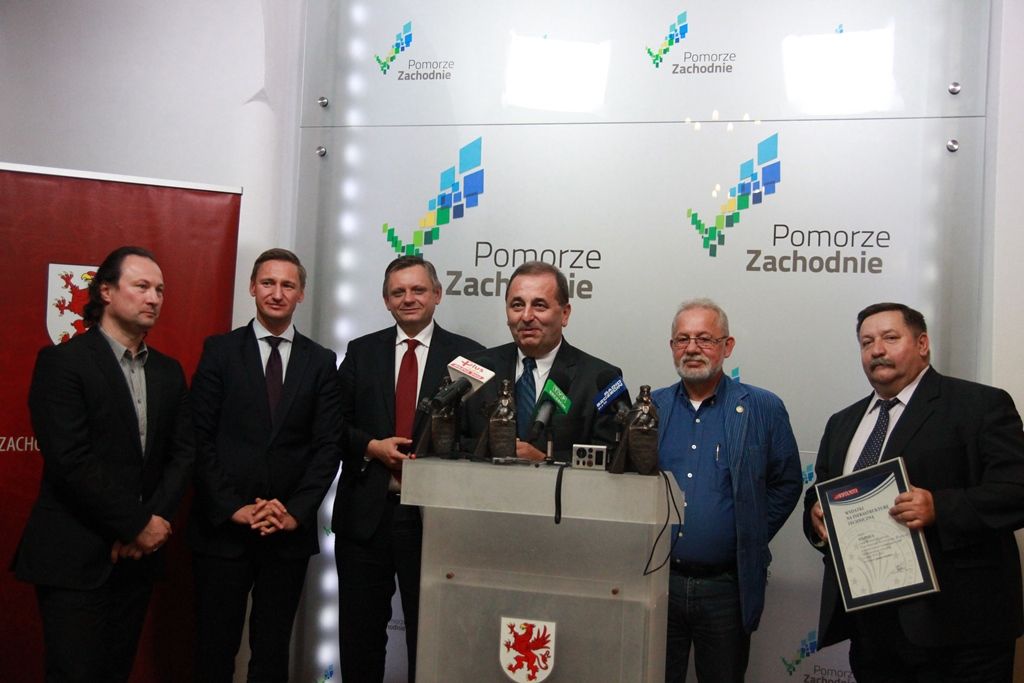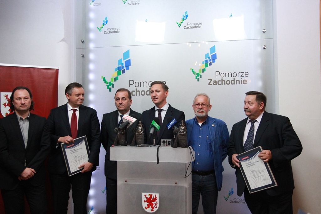 Marszałkowi województwa podczas spotkania z dziennikarzami towarzyszyli: prezydent Koszalina Piotr Jedliński, prezydent Świnoujścia Janusz Żmurkiewicz, wójt Rewala Robert Skraburski, burmistrz Nowego Warpna Władysław Kiraga i wójt Stepnicy Andrzej Wyganowski.